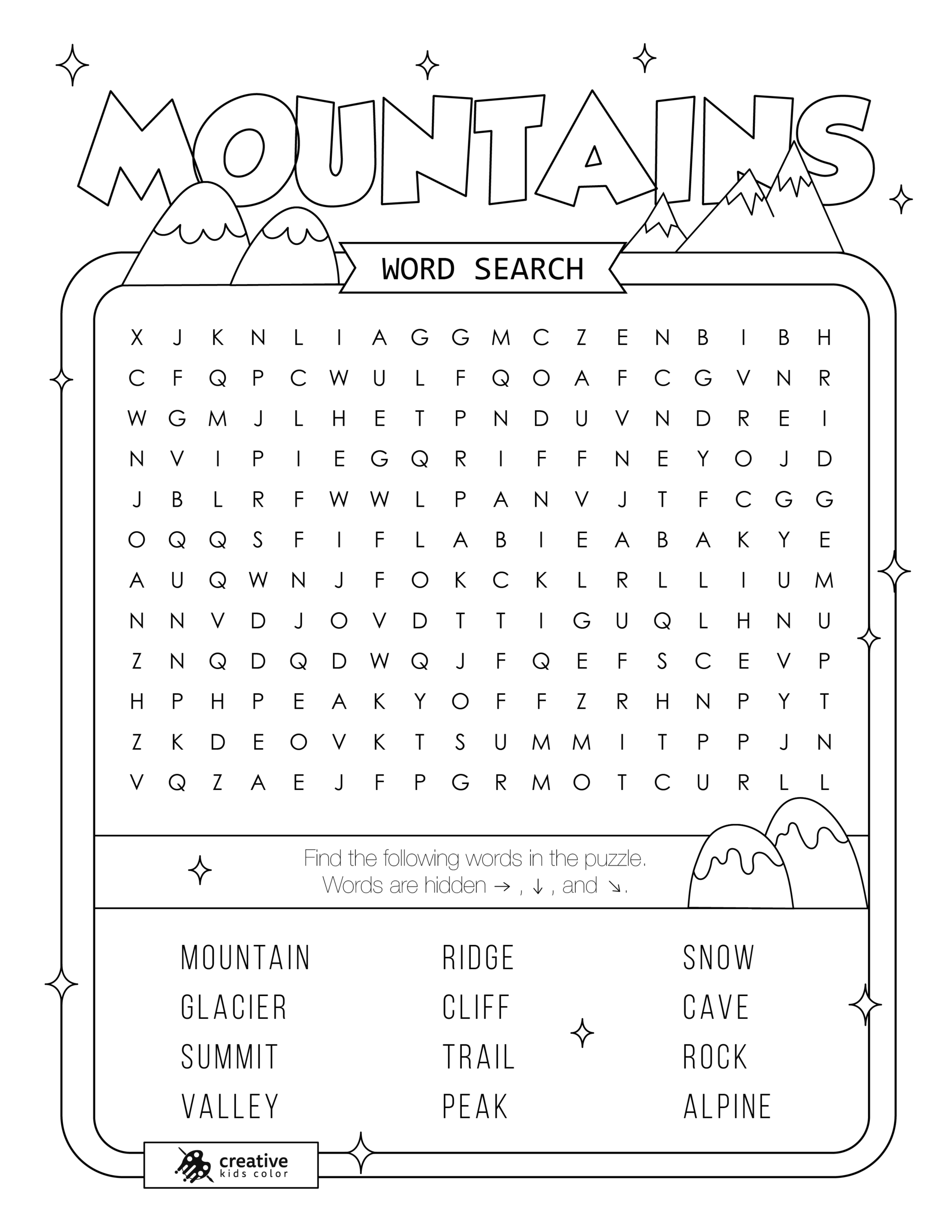 This Mountains word search puzzle includes 12 words to find from mountain to snow. It’s completely free and printable. Print now and push your limits!